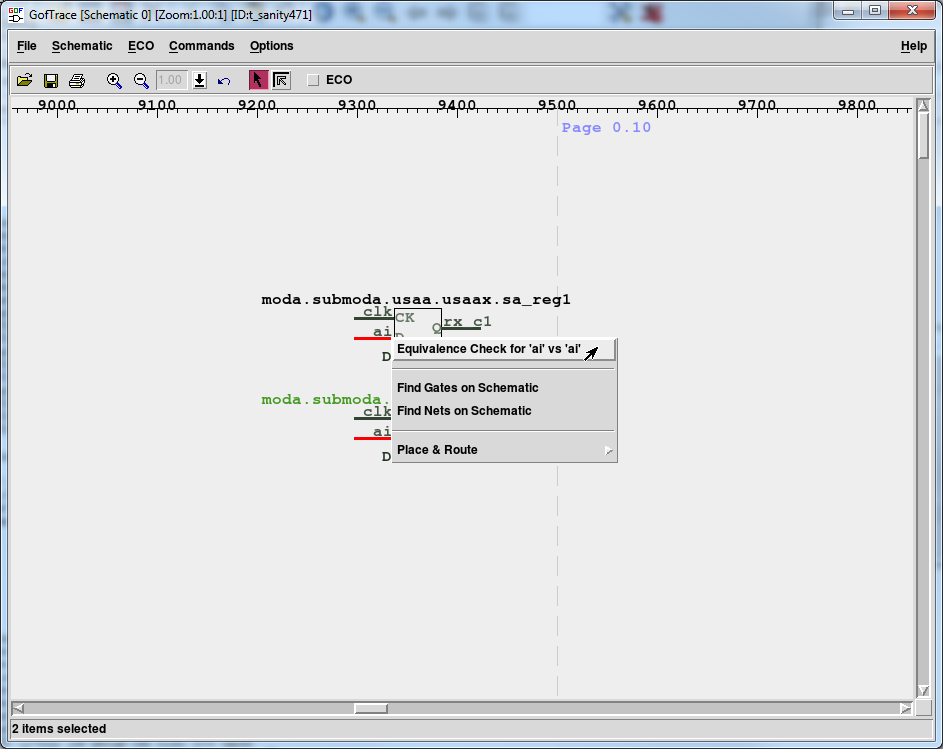 To perform the individual nets equivalence check in GOF, you can select two nets from the two netlists by holding down the "ctrl" key and clicking on the pins of both instances. Then, you can right-click and choose "Equivalence Check for ai vs ai".