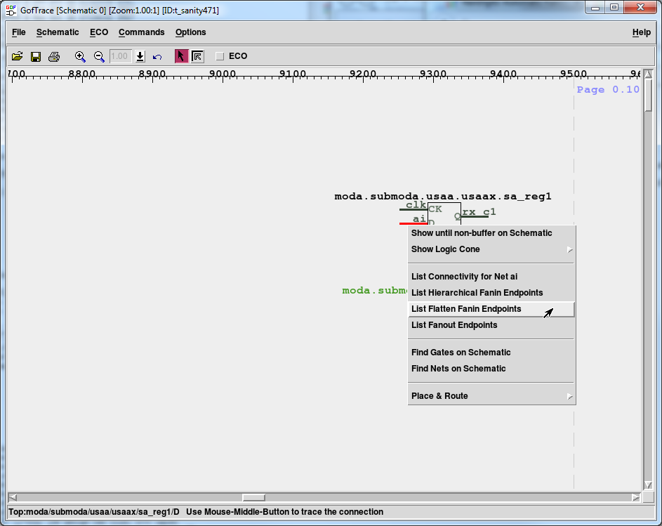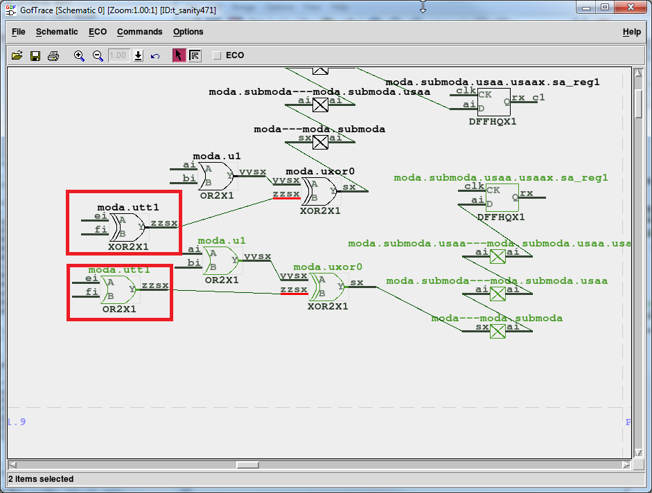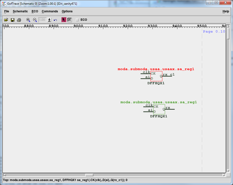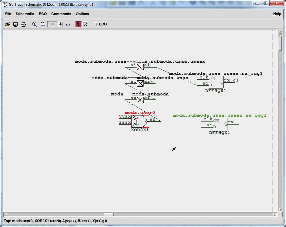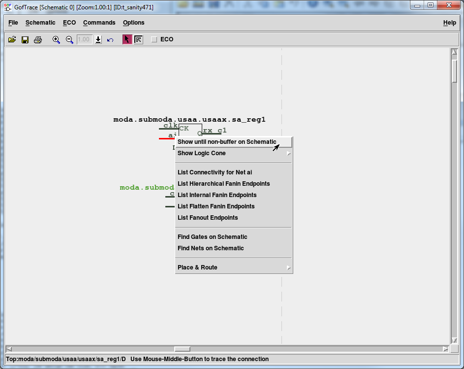 # GOF ECO script, debug_non_equivalence.pl use strict; setup_eco("eco_example"); # Setup ECO name read_library("art.90nm.lib"); # Read in standard library # Read in the Reference Netlist which is re-synthesized with several modules modified read_design("-ref", "reference.gv"); # Read in the netlist file after ECO read_design("-imp", "eco_verilog.v"); set_top("topmod"); # Set the top module set_ignore_output("TEST_SO*"); # To avoid test lockup to affect the ECO result set_pin_constant("TEST_EN",0); # To avoid test logic being touched sch("moda/submoda/usaa/usaax/sa_reg1", "-both"); # Load the failing point from both netlists