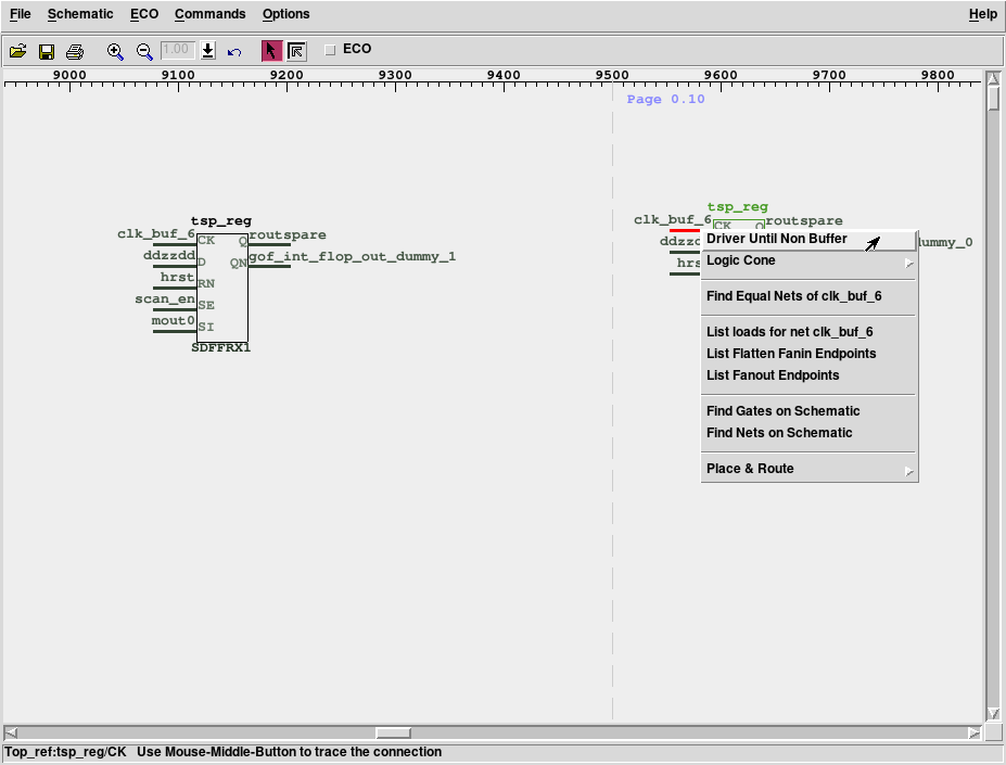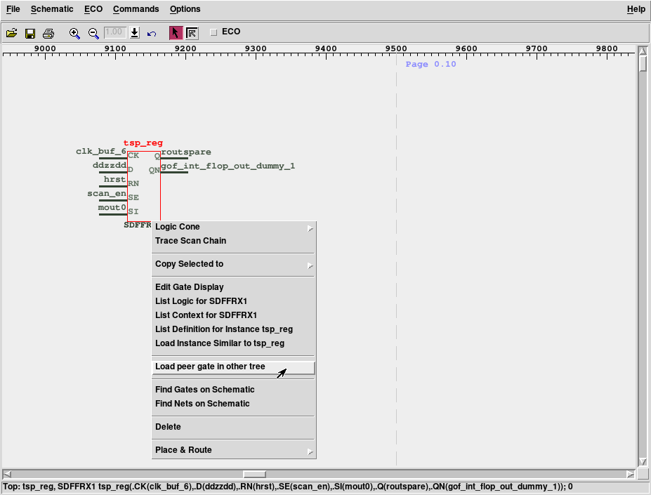 To address this issue, GOF ECO provides a solution within the functional netlist ECO process. By utilizing the built-in GUI debug mode, it becomes easier to identify the test mode constraints. Improperly set test mode constraints can result in numerous non-equivalent points appearing in the analysis. To simplify the debugging process, it is advisable to select a non-equivalent point that involves clock or reset pins, as they generally have less complex logic and are easier to debug. Within the GOF shell, which appears after the completion of the ECO script without an 'exit' command, the command 'sch the_noneq_instance' can be executed to load the instance to a schematic for further analysis and debugging.