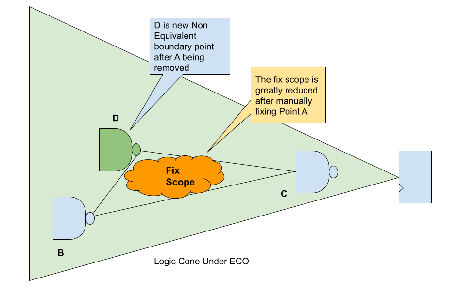 After manually fixing Point A using the 'change_pin' command, the ECO tool identifies new Point D, which together with Points B and C, refines the Fix Scope. This refinement often leads to a considerable reduction in the Fix Scope, as illustrated in Figure 2. A smaller Fix Scope can enhance the ECO tool's performance and potentially achieve better results.