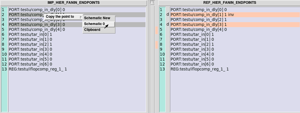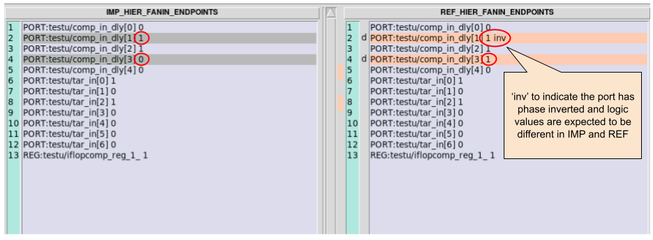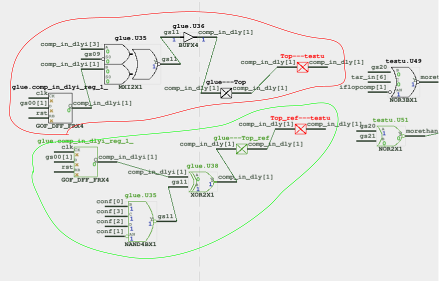 Following this action, Module C, which has been posing challenges during the debugging process, is effectively circumvented. Within the schematic, you can proceed to track the mismatched signals that were imported using the aforementioned method. These signals interface with Module C, although for the purpose of the debugging process, Module C can be considered equivalent. The tracing process persists until the ultimate source of the non-equivalence is uncovered. In this specific instance, as indicated in Figure 6, the disparate logic in comp_in_dly[1] emerges as the root cause of the non-equivalence. The Implementation Netlist is encircled in red and the Reference Netlist is encircled in green.