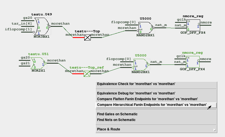 For instance, in Figure 2, when we examine a module in more detail, the circuit's format varies between the two netlists. Specifically, the Implementation Netlist shows a port driven by a 3-input NOR gate, whereas the Reference Netlist shows the same port driven by a 2-input NOR gate. In such cases, extending the schematic to more levels could be beneficial for ongoing debugging efforts. But this new approach for verifying the logic values of boundary signals proves to be a more efficient method.