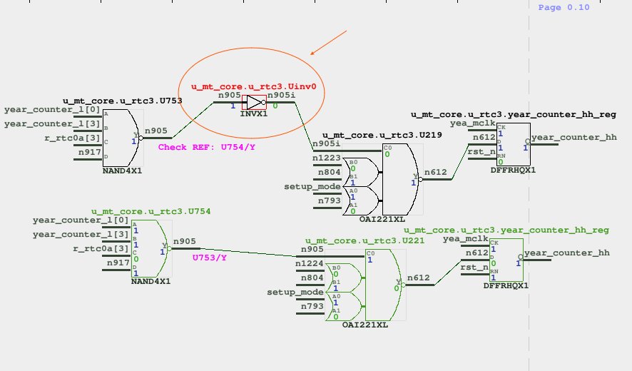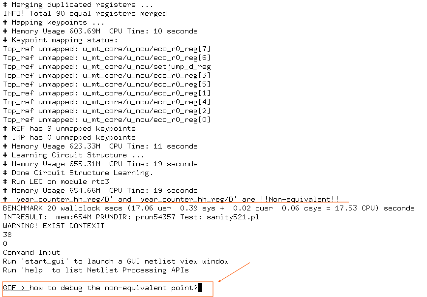 # 'year_counter_hh_reg/D' and 'year_counter_hh_reg/D' are !!Non-equivalent!! BENCHMARK 20 wallclock secs (17.06 usr 0.39 sys + 0.02 cusr 0.06 csys = 17.53 CPU) seconds INTRESULT: mem:654M PRUNDIR: prun54357 Test: sanity521.pl WARNING! EXIST DONTEXIT 38 0 Command Input Run 'start_gui' to launch a GUI netlist view window Run 'help' to list Netlist Processing APIs GOF > how to debug the non-equivalent point?
