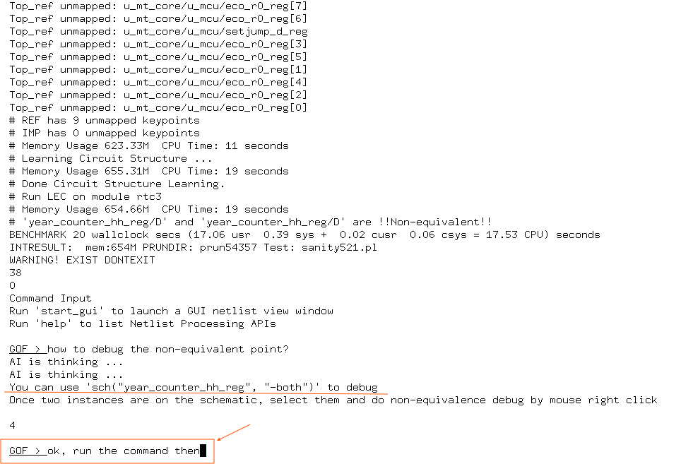 Debugging non-equivalent points in complex IC designs can be a time-consuming task, often requiring users to remember specific API commands and their syntax. GOF addresses this challenge by integrating an AI-powered natural language interface directly into its shell, allowing users to interact with the tool using plain English queries. This significantly streamlines the debugging process, making it more intuitive and efficient.