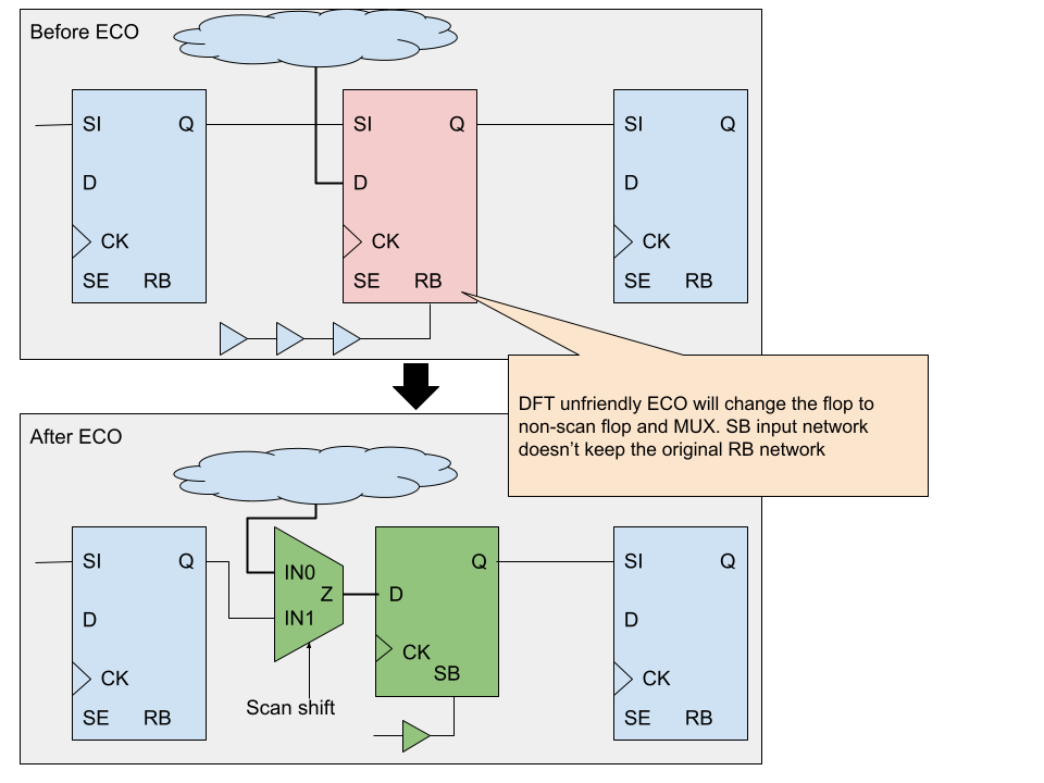 An ECO that is DFT-unfriendly replaces the original scan flop with a non-scan flop with settable type. Additionally, an extra MUX is added to choose between the scan shift mode or functional mode. As illustrated in Figure 2, this approach is DFT-unfriendly, even though the DFT may still function. Moreover, the reset signal network is modified to use a different signal. This behavior is typical of Conformal ECO.