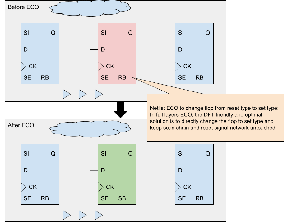 As depicted in Figure 1, suppose a resettable type flop needs to be swapped with a settable type flop. In that case, the optimal ECO solution is to replace the flop directly with a settable type flop while keeping the scan chain and reset signal network untouched. This approach ensures that the ECO is DFT-friendly and timing-friendly, and this is precisely how GOF ECO operates.