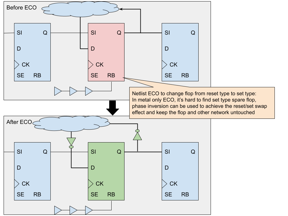 Metal Only ECO can present challenges in finding a nearby corresponding spare flop for resettable/settable swapping. In such cases, the phase inversion method can be used to achieve the same effect. By inserting inverts in the D input and Q output driving functional fanout, as illustrated in Figure 3, the ECO can be accomplished at minimal cost in Metal Only ECO.