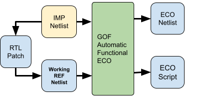 To optimize the gate level size of the final RTL Patch, it is first applied to the Reference Netlist, which is then used to correct the Implementation Netlist. It is important to note that in RTL Patch ECO, the initial Reference Netlist is identical to the Implementation Netlist. The RTL Patch is applied to the initial Reference Netlist to generate a working Reference Netlist, which may contain a patch size of hundreds of gates. When the working Reference Netlist is used to fix the original Implementation Netlist, GOF can locate equivalent points in the Implementation Netlist to replace the gates in the synthesized patch. As a result, the final optimized patch size may only include a few gates.