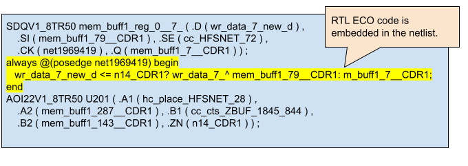 The Embedded RTL Patch is integrated directly into the netlist. When the netlist is read, the patch is synthesized into gate level in an incremental manner. The newly generated gates are then saved directly into the ECOed netlist when using the "write_verilog" command. This approach is suitable for making small modifications.