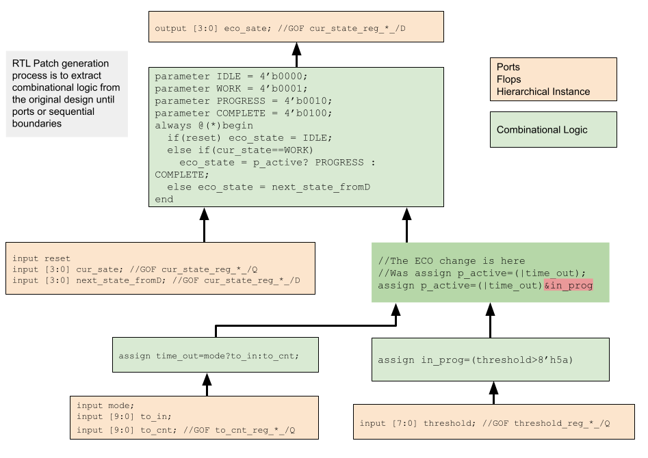RTL Patch can be generated by collecting the related combinational logic in the original design. The boundaries are ports or sequential logic.