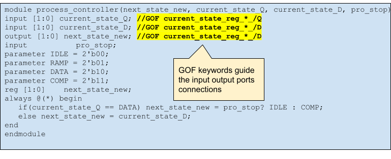 In the expression, "input current_state_D; //GOF current_state_reg/D", the instance current_state_reg/D is driven by U456/Z before ECO. During ECO, GOF connects current_state_D to U456/Z.