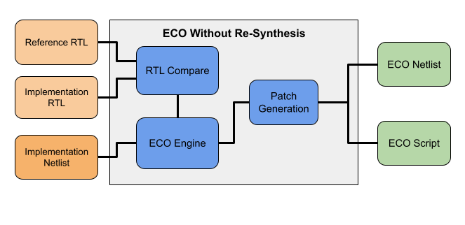 The ECO modes listed above are integrated into one work environment seamlessly. The mixing of ECO modes can produce most optimal ECO result. For example, automatic ECO and manual script ECO can be done in one ECO script, so that the minimum size ECO patch can be achieved.