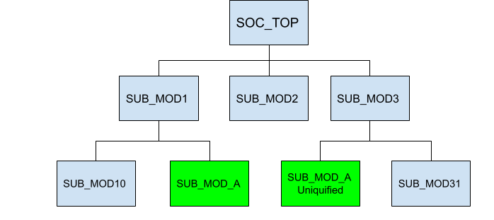 However, the team must factor in the boundary optimization of the sub-modules during backend processing. A given sub-module may have undergone unique transformations, resulting in the creation of multiple distinct physical modules with diverse backend optimizations. Illustrated in Figure 6, an instance of SUB_MOD_A may exemplify a backend modification, such as a port inversion.