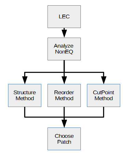 Meanwhile, the Cut Point Method endeavors to correct any potential signals in the implementation netlist by identifying the best location to fix non-equivalences with the least patch possible.