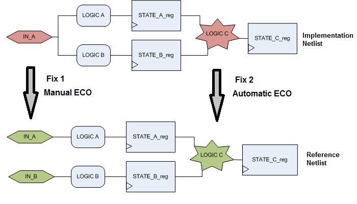 If only Automatic ECO is applied, Fix 1 (IN_A/IN_B/LOGIC-A/LOGIC-B) would require approximately 200 gates. However, by using GOF APIs to analyze the logic paths from port IN_A to STATE_A_reg and STATE_B_reg, we can identify that LOGIC A and LOGIC B have very few gated shared. Thus, duplicating these shared gates would allow for a clean cut of LOGIC A and LOGIC B, enabling them to be driven separately by IN_A and IN_B. Click here for this mixed mode ECO use case.