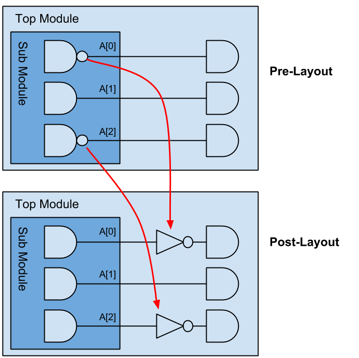 In Place & Route stage, backend tool may change a port's phase. So a bus port name is the same in post-layout netlist, but logic wise, one or more of the bus bits may have been inverted caused by inverter moved across hierarchy boundary, as shown in Figure 1. Bus port 'A' in module 'Sub Module' has bit 0 and bit 2 inverted, and the parent level module has inverters inserted in fanouts of bit 0 and bit 2. It is called boundary optimization in P&R stage.