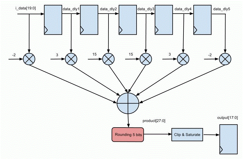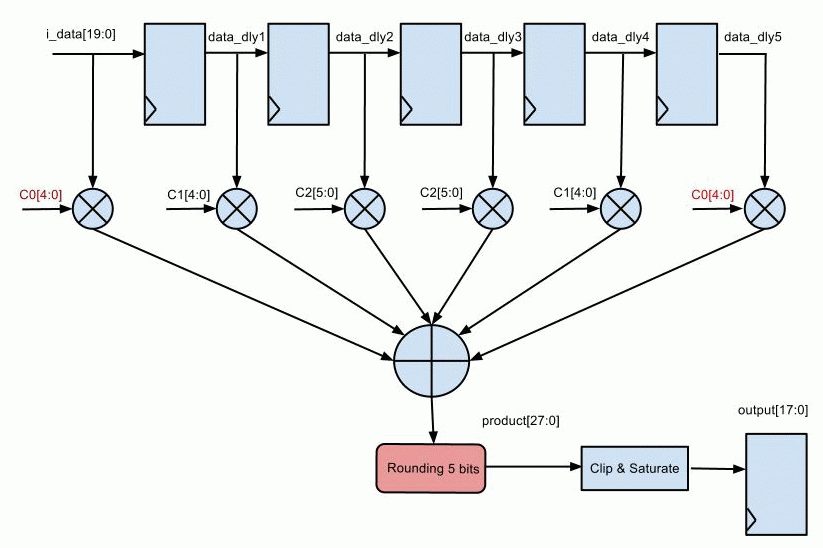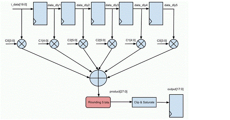 ... parameter WIDTH = 20; parameter WC = 5; always @(*) data_dly0 = i_data; always @(posedge clk) begin data_dly1 <= data_dly0; data_dly2 <= data_dly1; data_dly3 <= data_dly2; data_dly4 <= data_dly3; data_dly5 <= data_dly4; end wire signed [WIDTH:0] preadd0 = data_dly0 + data_dly5; wire signed [WIDTH:0] preadd1 = data_dly1 + data_dly4; wire signed [WIDTH:0] preadd2 = data_dly2 + data_dly3; wire signed [WIDTH+WC:0] m0 = preadd0 * c0; wire signed [WIDTH+WC:0] m1 = preadd1 * c1; wire signed [WIDTH+WC:0] m2 = preadd2 * c2; wire signed [WIDTH+WC+2:0] product = m0 + m1 + m2; // Round logic is missed in the following line wire [WIDTH+WC+2:0] rproduct = product; // '+16' part is to add the rounding logic //wire [WIDTH+WC+2:0] rproduct = product + 16; wire [WIDTH-3:0] sat_out; saturate #(.BW_IN(WIDTH+1), .BW_OUT(WIDTH-2)) u_saturate(.sat_in(rproduct[WIDTH+5:5]), .sat_out(sat_out[WIDTH-3:0])); reg [WIDTH-3:0] pout; always @(posedge clk) pout <= sat_out; ...