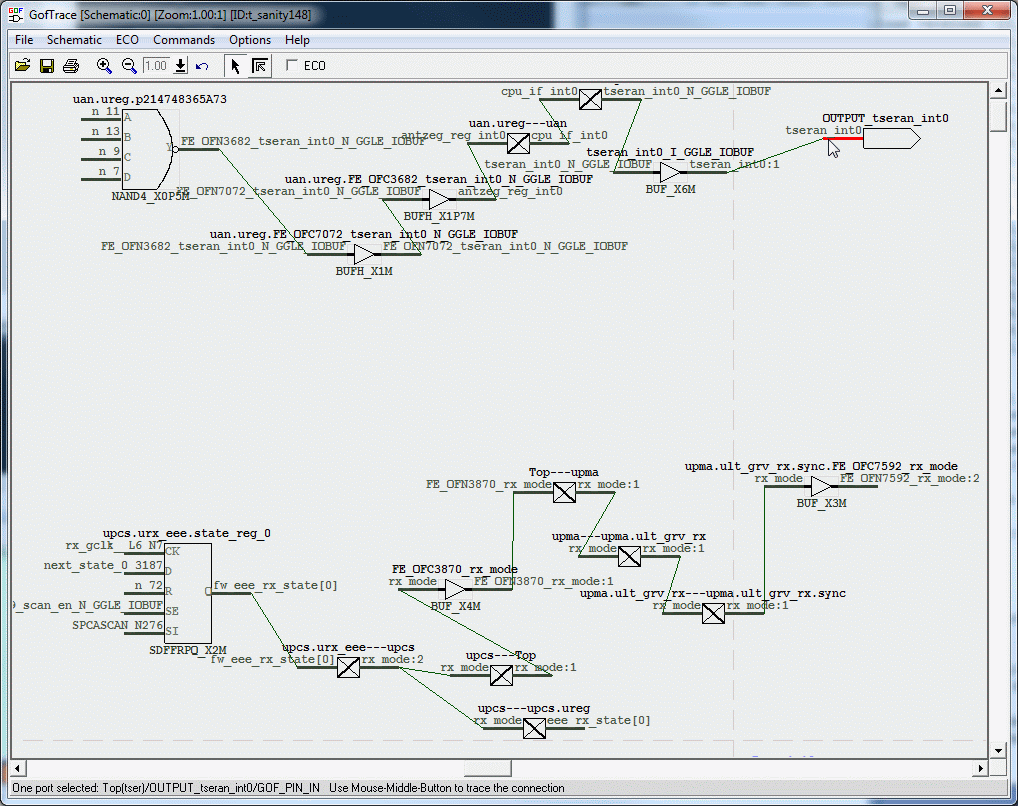 Starting from the port, 'tseran_int0', use mouse-middle-button to trace the gates. Load the enable signal 'rx_mode' to the schematic as well and trace to make a proper circuit.